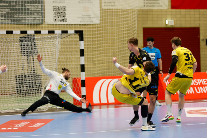Von diesem Fehlstart erholten sich die Gastgeber nur schwer. Erst nach der Umstellung auf die 7-gegen-6-Variante kam mehr Struktur ins Angriffsspiel. In der Defensive verhinderten Finn Rüspeler und Moritz Ebert mit jeweils drei Paraden Schlimmeres, sodass der Rückstand zur Pause auf fünf Treffer begrenzt werden konnte (10:16).